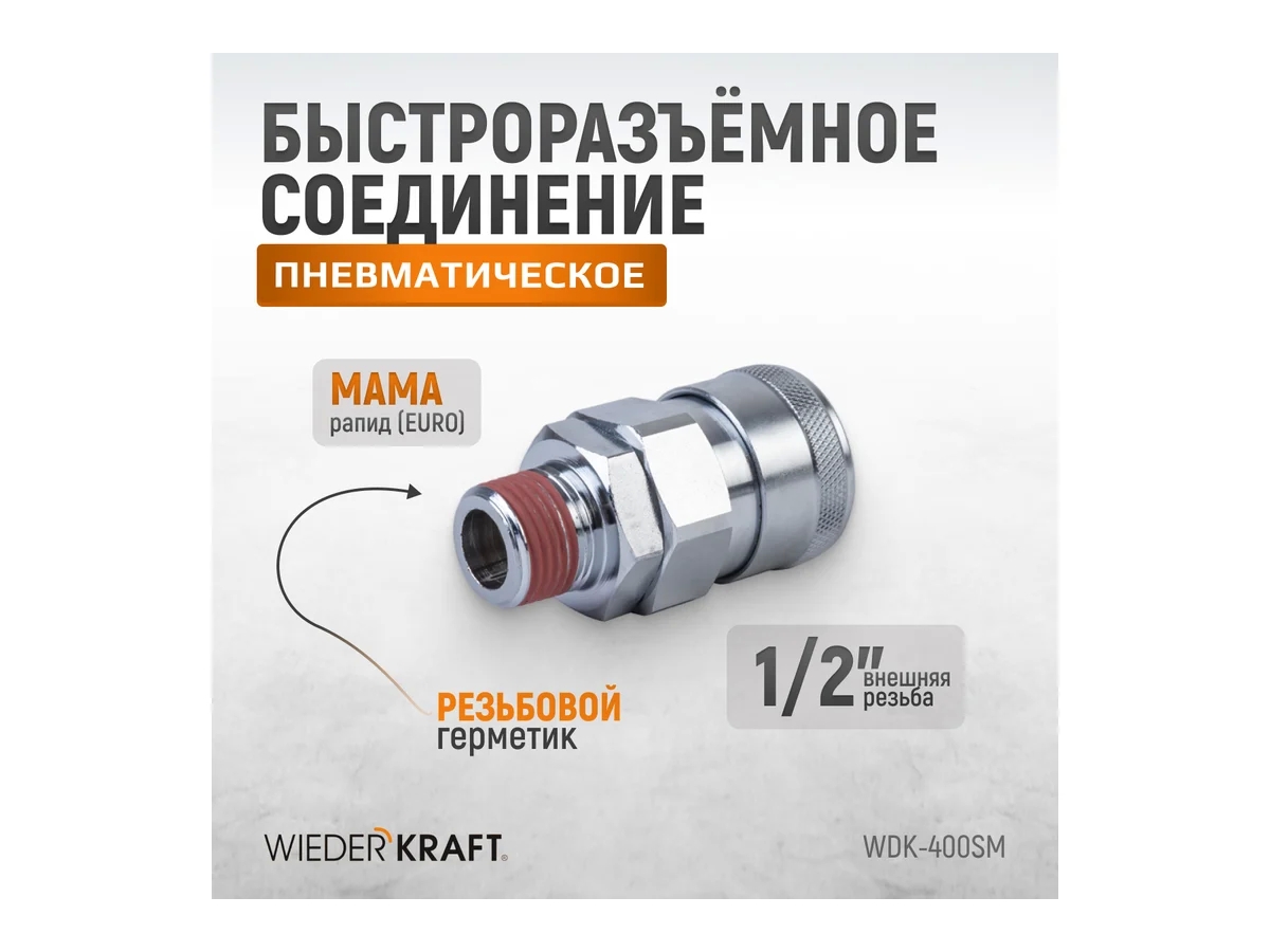 Штекер высокой пропускной способности WIEDERKRAFT WDK-400SM типа «мама» с увеличенным диаметром и внешней резьбой 1/2" M предназначен для подключения пневматического инструмента и оборудования. С одной стороны фитинг имеет быстросъемное соединение «мама», диаметр которого больше стандартного EURO, с другой — наружную резьбу 1/2"M («папа»).