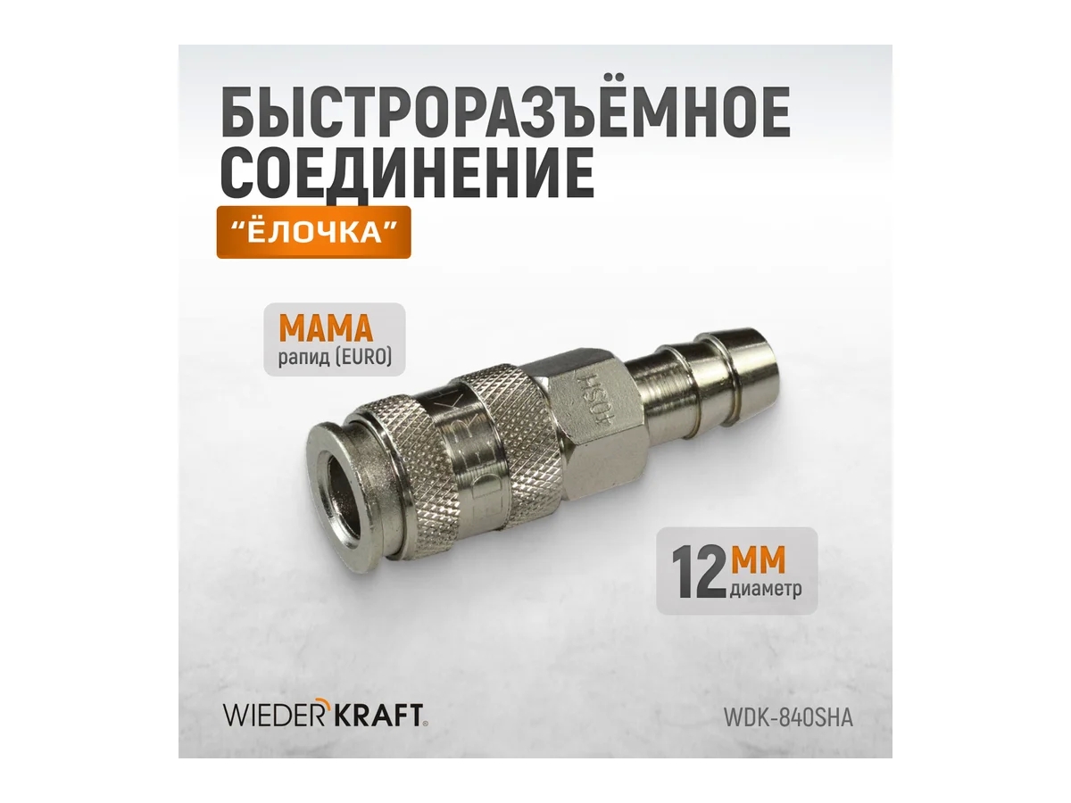 Пневматическое стальное быстросъемное соединение рапид-елочка 12 мм WIEDERKRAFT WDK-840SHA. Применяется для подключения пневматического инструмента и оборудования, соединения различных элементов пневмосистем.
