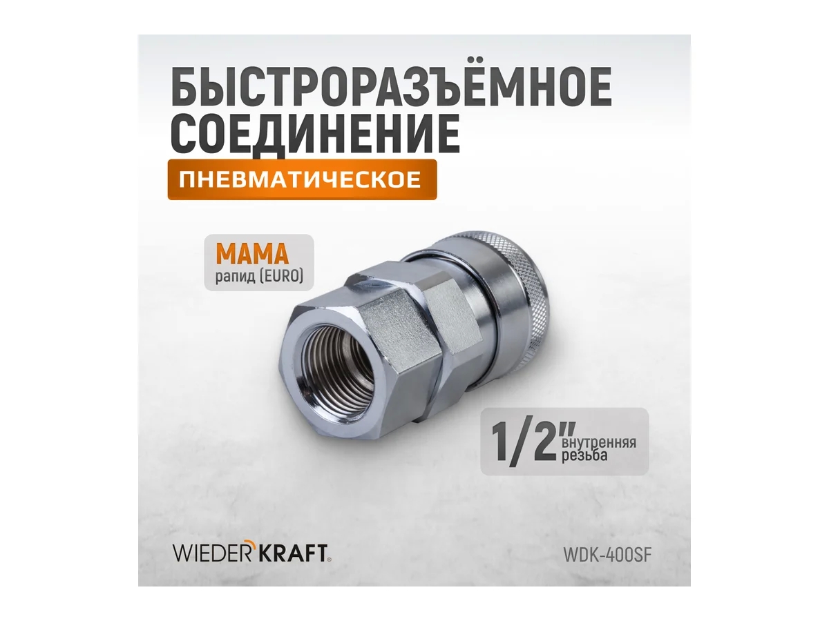 Штекер высокой пропускной способности WIEDERKRAFT WDK-400SF типа «мама» с увеличенным диаметром и внутренней резьбой 1/2" F предназначен для подключения пневматического инструмента и оборудования. С одной стороны фитинг имеет быстросъемное соединение «мама», диаметр которого больше стандартного EURO, с другой — внутреннюю резьбу 1/2"F («мама»).