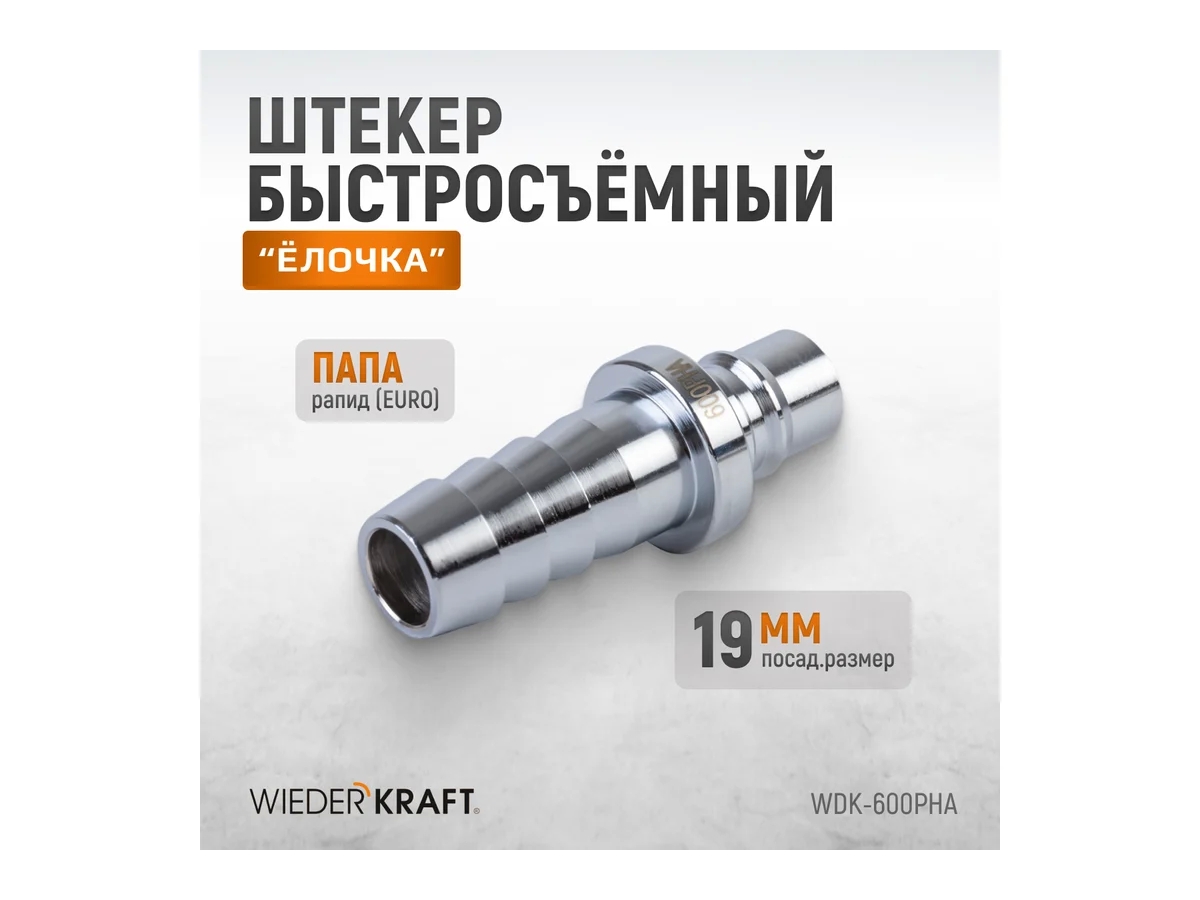 Штекер высокой пропускной способности WIEDERKRAFT WDK-600PHA типа «папа» с увеличенным диаметром и елочкой 19 мм предназначен для подключения пневматического инструмента и оборудования. С одной стороны фитинг имеет быстросъемное соединение «папа», диаметр которого больше стандартного EURO, с другой – соединение типа «елочка» (штуцер с зубчатой насечкой) для подключения к пневмошлангу с внутренним диаметром 19 мм.