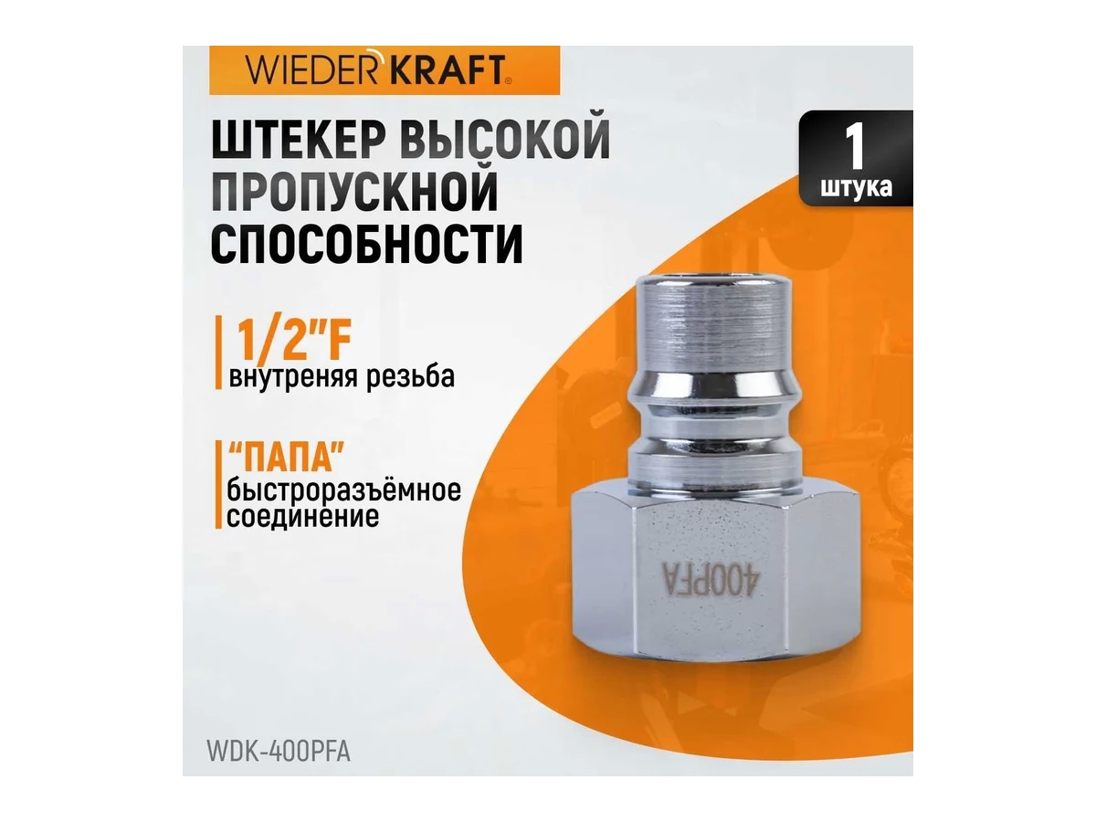 Штекер высокой пропускной способности WIEDERKRAFT WDK-400PFA типа «папа» с увеличенным диаметром и внутренней резьбой 1/2" F предназначен для подключения пневматического инструмента и оборудования. С одной стороны фитинг имеет быстросъемное соединение «папа», диаметр которого больше стандартного EURO, с другой — внутреннюю резьбу 1/2"F («мама»).