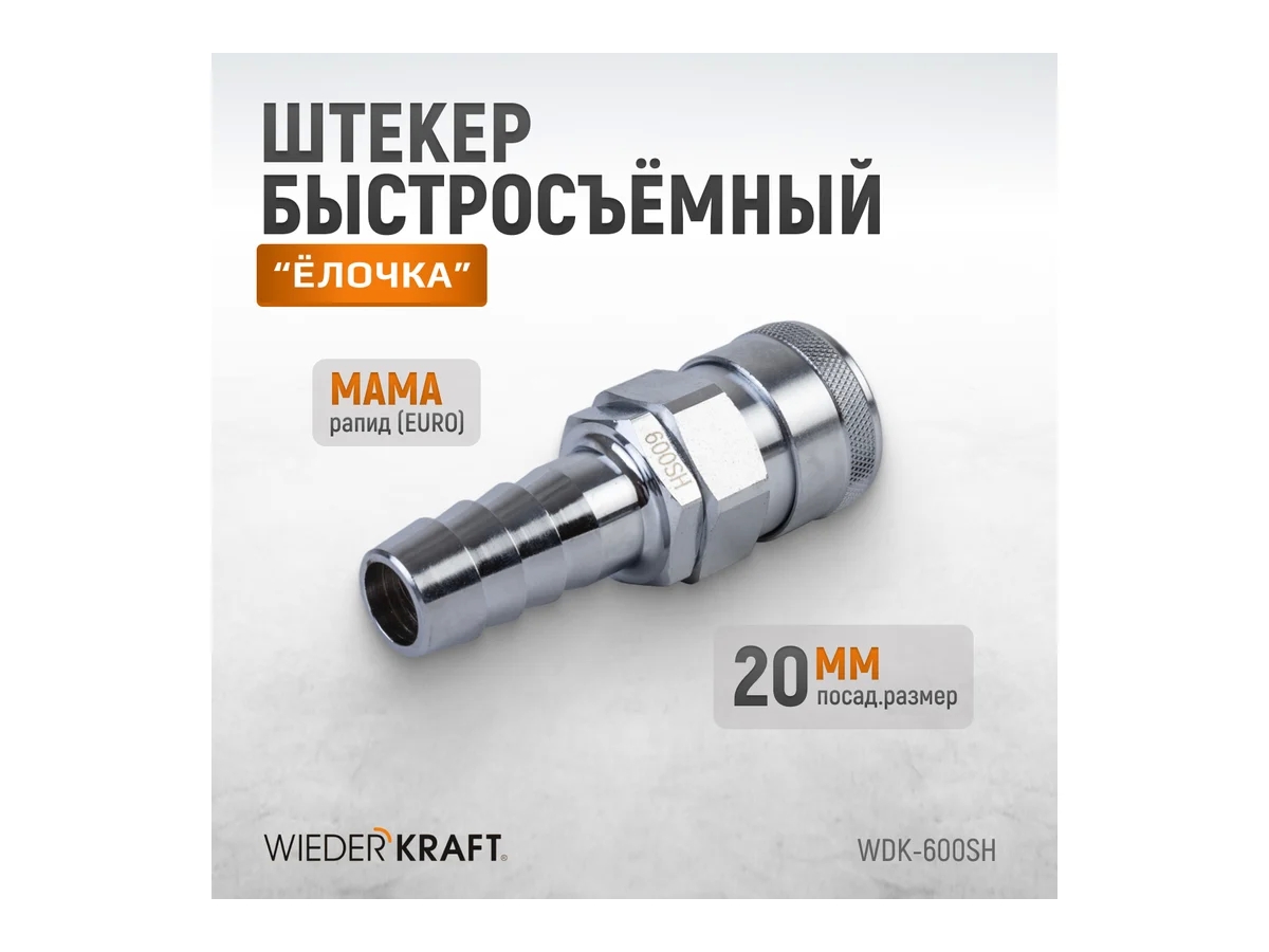 Штекер высокой пропускной способности WIEDERKRAFT WDK-600SH типа «мама» с увеличенным диаметром и елочкой 20 мм предназначен для подключения пневматического инструмента и оборудования. С одной стороны фитинг имеет быстросъемное соединение «мама», диаметр которого больше стандартного EURO, с другой – соединение типа «елочка» (штуцер с зубчатой насечкой) для подключения к пневмошлангу с внутренним диаметром 20 мм.