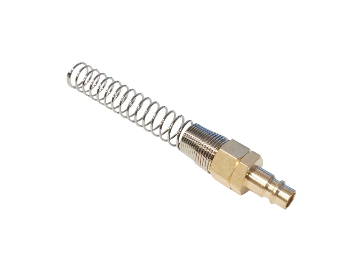 Латунный переходник "папа" быстросъемный с креплением под шланг 10*14 мм и пружиной для защиты шланга. Предназначен для присоединения к пневматическим шлангам через обжимное крепление. Применяется совместно с быстросъемным соединением "мама".