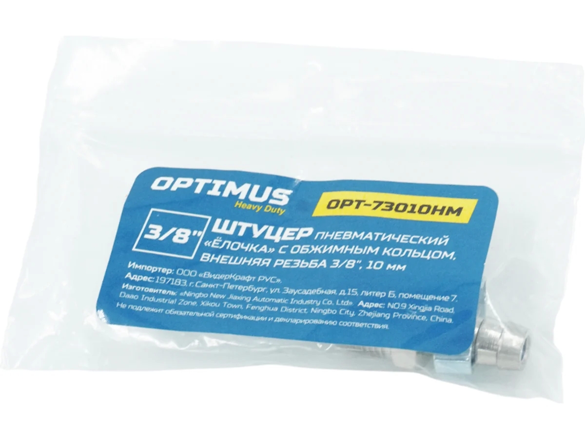 Пневматический штуцер типа ёлочка OPT-73010HM с обжимным кольцом и внешней резьбой 3/8", диаметр 10 мм.