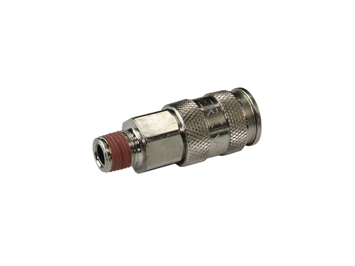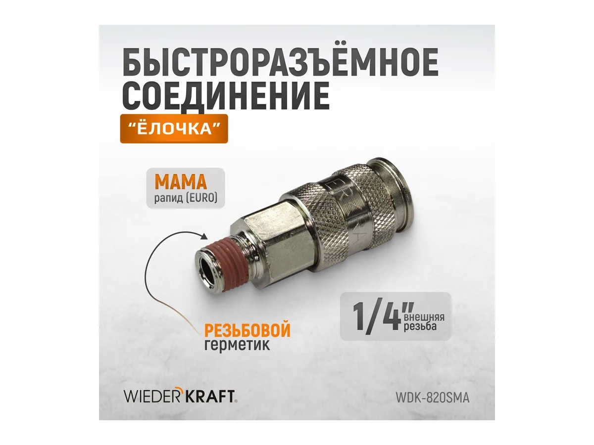 Пневматическое быстросъемное соединение WIEDERKRAFT WDK-820SMA типа «мама» с наружной резьбой 1/4" предназначено для подключения пневмоинструмента, оборудования и элементов пневмосистем. С одной стороны фитинг имеет быстроразъемное соединение типа «мама», с другой — наружную резьбу М 1/4.
