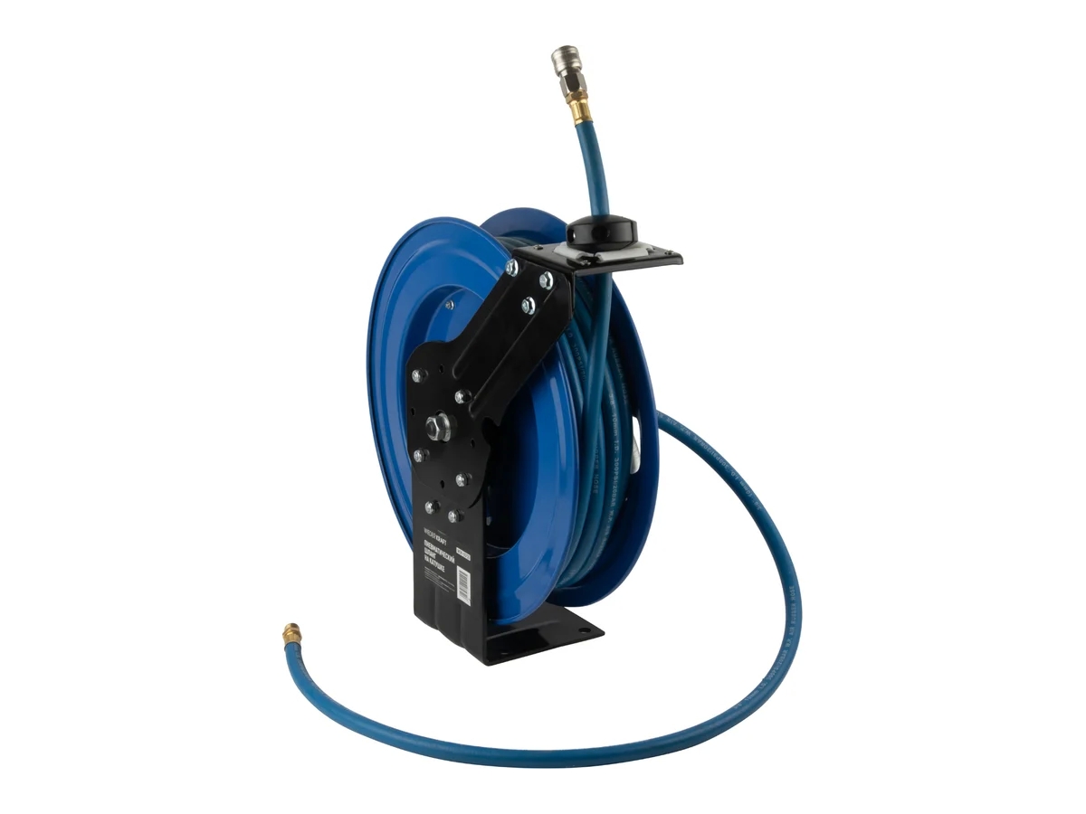Шланг на возвратной катушке WiederKraft WDK-65730 для воздуха или воды оснащен надежным возвратным механизмом (усталостнопрочная стальная пружина). Катушка установлена на двух шарикоподшипниках, тем самым уменьшая нагрузку на силовую пружину.