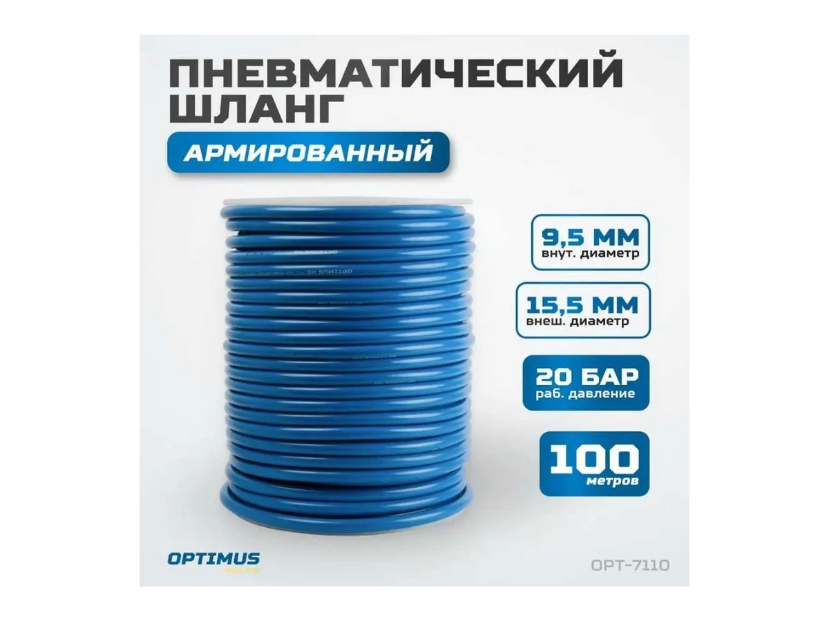 Пневматический шланг OPT-7110, 100 м предназначен для подключения пневмоинструмента к компрессору. Применяется на СТО и в автосервисах. Пневмошланг изготовлен из мягкой резиновой основы с армированием и ПВХ наружным слоем, что обеспечивает высокую гибкость, прочность и стойкость к техническим жидкостям и ультрафиолету.