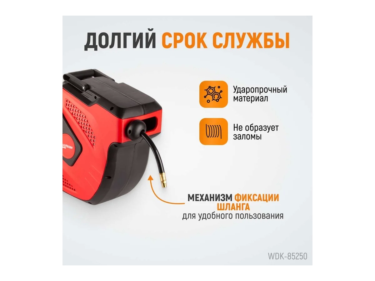 Шланг пневматический армированный PVC WIEDERKRAFT WDK-85250 предназначен для соединения воздухонагнетательного оборудования с различным пневматическим инструментом. Устойчив к разрывам, сгибам и перекручиванию в процессе работы. Шланг оснащен фитингами с резьбой 1/4''. Размещен на автоматической катушке закрытого типа, оснащенной поворотной скобой для крепления к стене. Шланг легко вытягивается и автоматически сворачивается, что обеспечивает удобство работы.