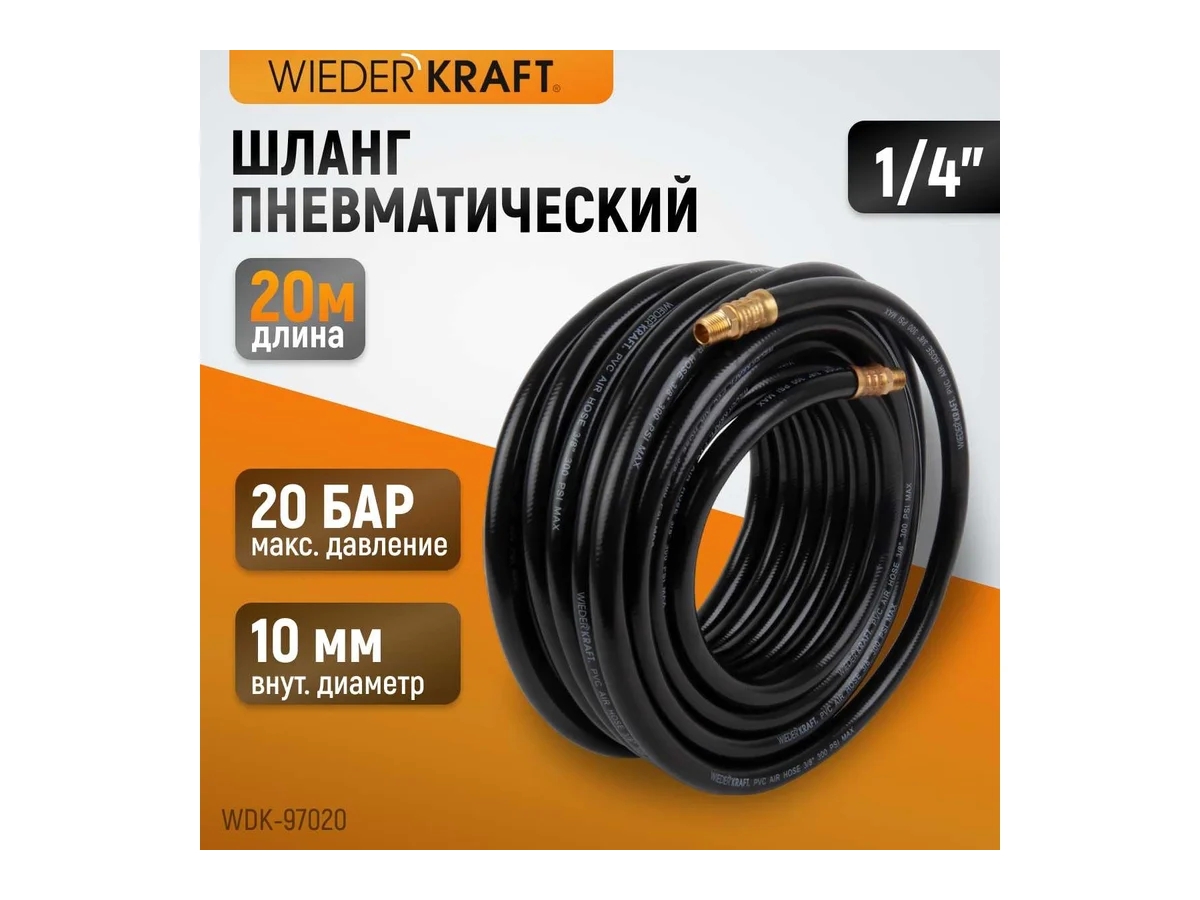 Прочный армированный шланг для воздуха и воды WDK-97020 длиной 20 метров. Крайне устойчив к перепадам температур, изгибам и переломам. Имеет внешний диаметр 16 мм и внутренний 10 мм (3/8?).