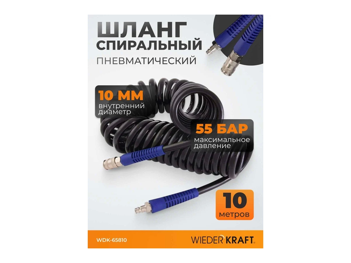 Спиральный полиуретановый шланг WDK-65810 длиной 10 м предназначен для подачи сжатого воздуха от магистрали или компрессора к пневмоинструменту. Изготовлен из прочного полиуретана, устойчивого к воздействию масла, бензина и других химически агрессивных сред, а также перепадам температур.