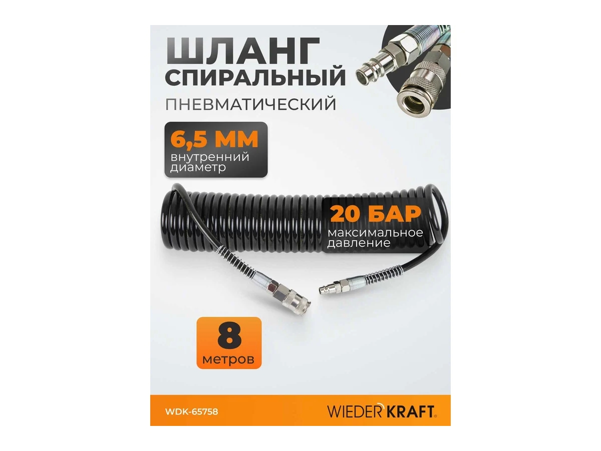 Спиральный полиуретановый шланг WDK-65758 длиной 8 м прелназначен для подачи сжатого воздуха от магистрали или компрессора к пневмоинструменту. Изготовлен из прочного полиуретана, устойчивого к воздействию масла, бензина и других химически агрессивных сред, а также перепадам температур. Пружины на законцовках защищающают шланг от перегибов.