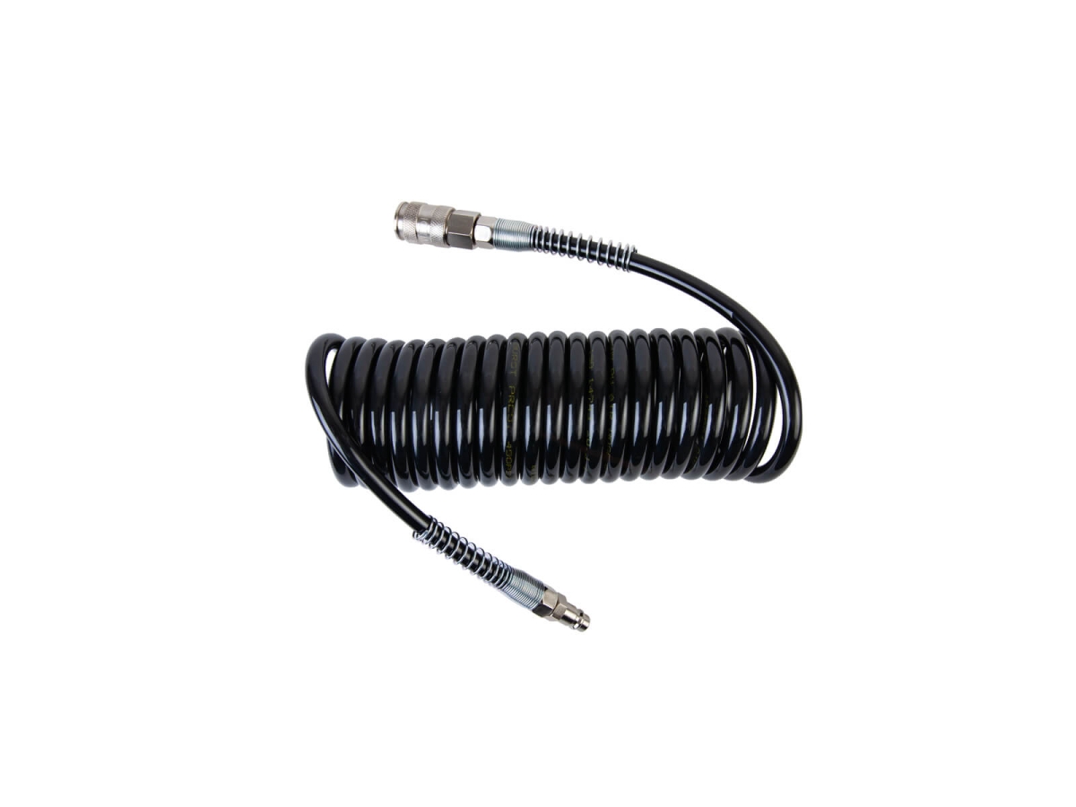 Спиральный полиуретановый шланг WDK-65757 длиной 5 м прелназначен для подачи сжатого воздуха от магистрали или компрессора к пневмоинструменту. Изготовлен из прочного полиуретана, устойчивого к воздействию масла, бензина и других химически агрессивных сред, а также перепадам температур. Пружины на законцовках защищающают шланг от перегибов.