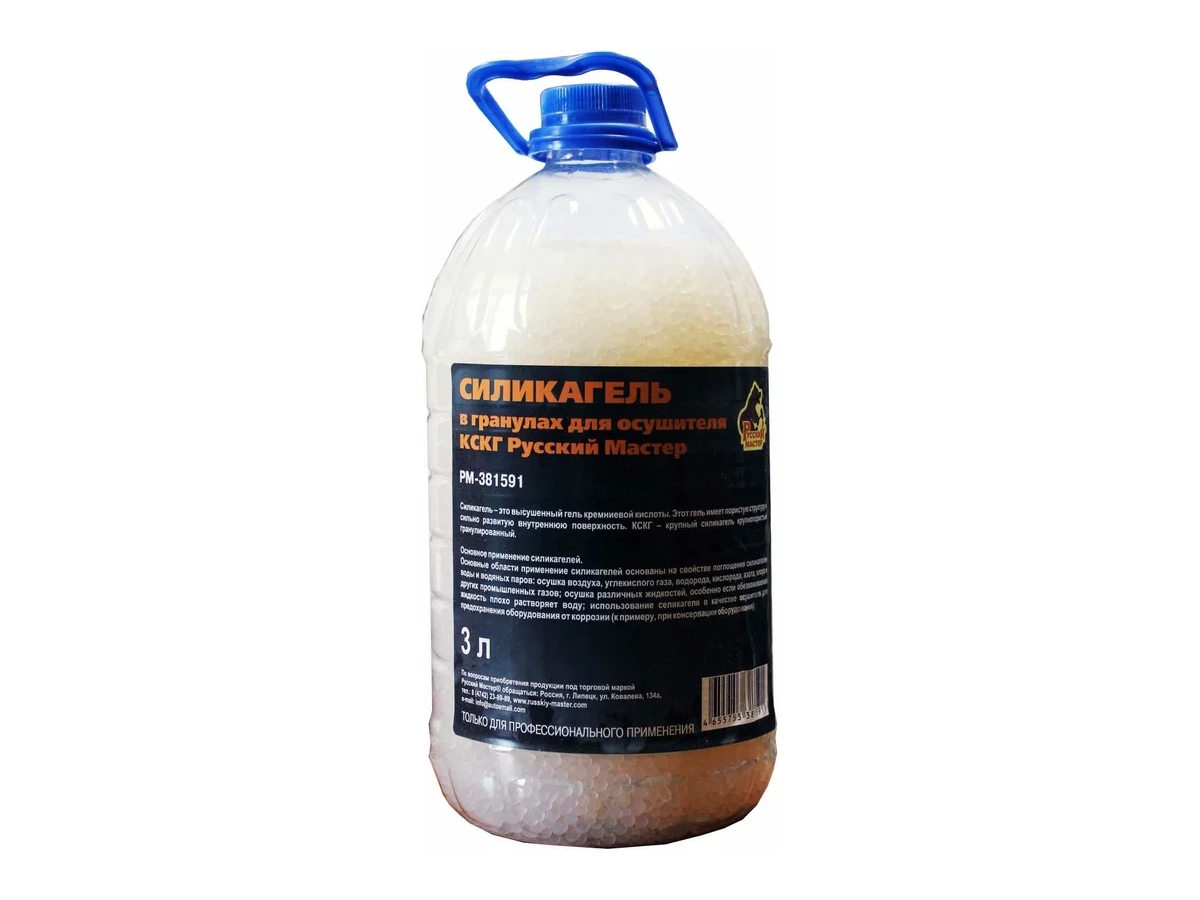Силикагель в гранулах для осушителя КСКГ 3 л Русский Мастер РМ-381591 - крупный силикагель крупнопористый гранулированный - высушенный гель кремниевой кислоты. Имеет пористую структуру и сильно развитую внутреннюю поверхность.