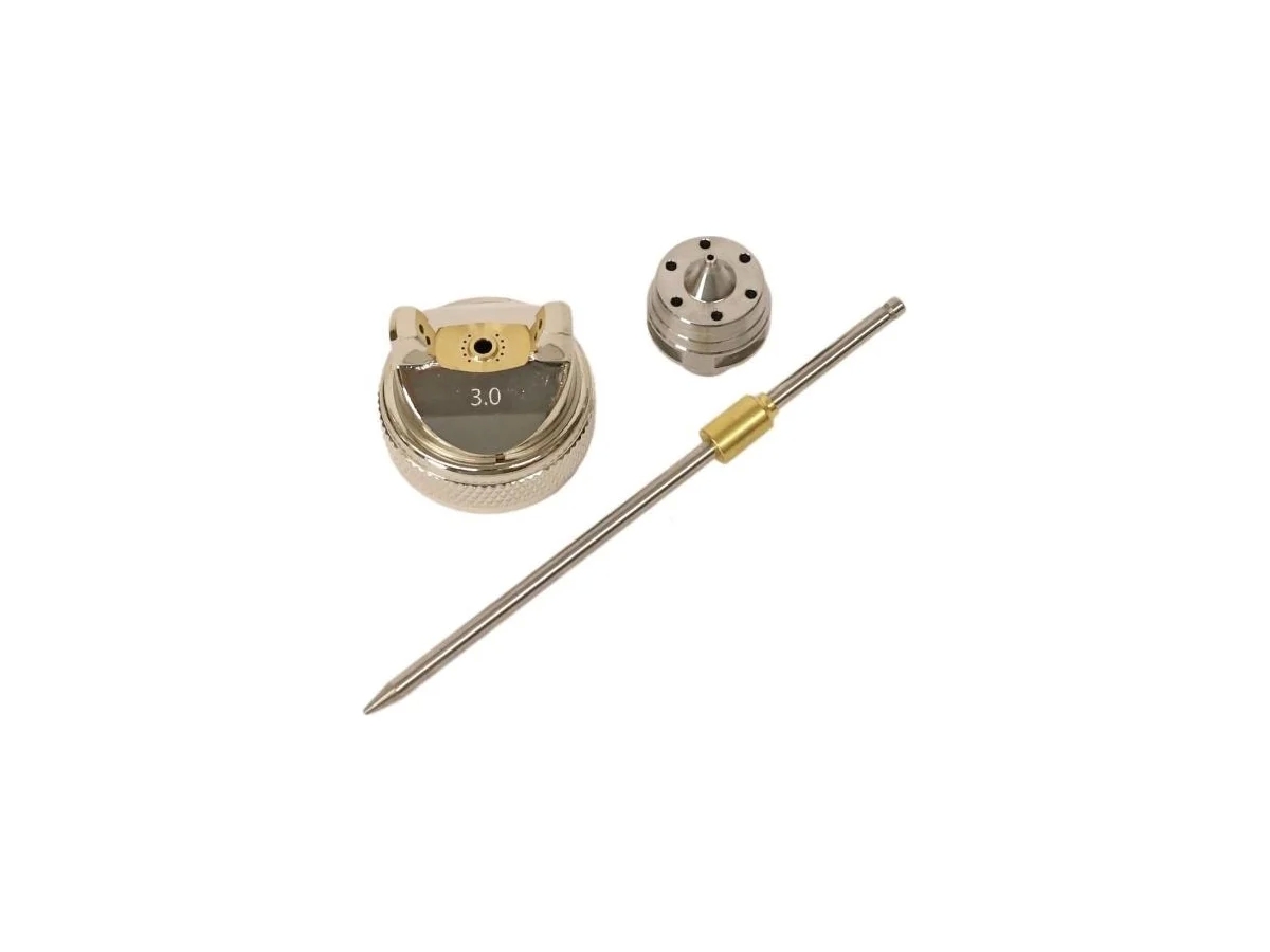 Сменные комплекты сопла для краскопульта состоят из воздушной головки, дюзы и иглы, которые подобраны и отъюстированы (подогнаны) вручную для получения факела оптимального размера и формы.