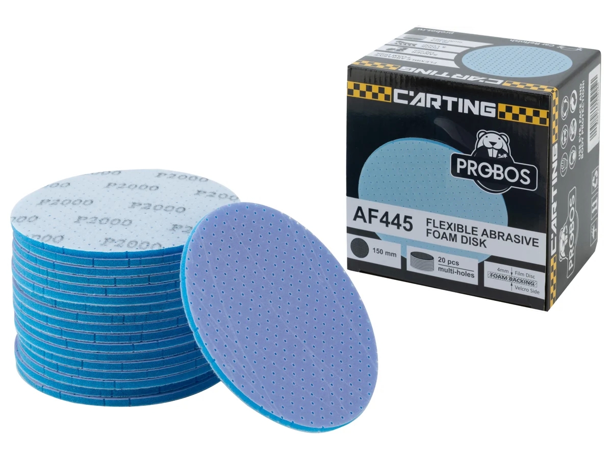 PROBOS Carting AF445— сериягибких абразивных круговна мягкой вспененной основе. Предназначены для обработки поверхностей, в частности лакокрасочных покрытий (ЛКП).