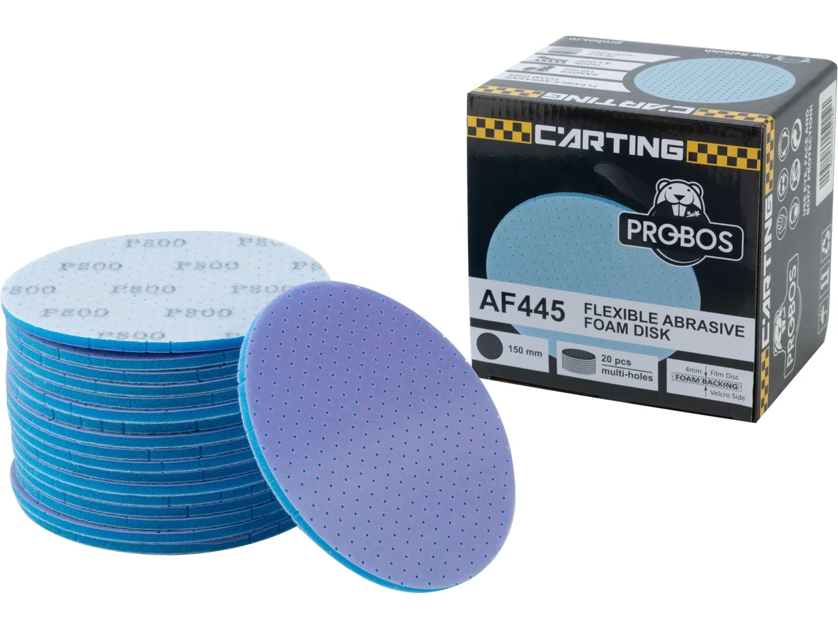 PROBOS Carting AF445— сериягибких абразивных круговна мягкой вспененной основе. Предназначены для обработки поверхностей, в частности лакокрасочных покрытий (ЛКП).