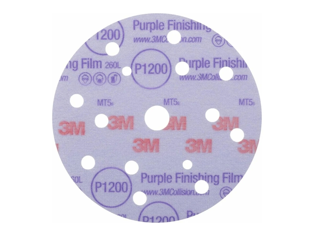 Микротонкие полировальные круги 3М Hookit Purple 260L - на основе оксида алюминия используются для удаления мелких шлифовальных рисок с зашлифованного участка перед окрашиванием, а также для удаления пылинок и излишней шагрени с финишных покрытий. Предназначены для сухой шлифовки с помощью орбитально-шлифовальных машин.