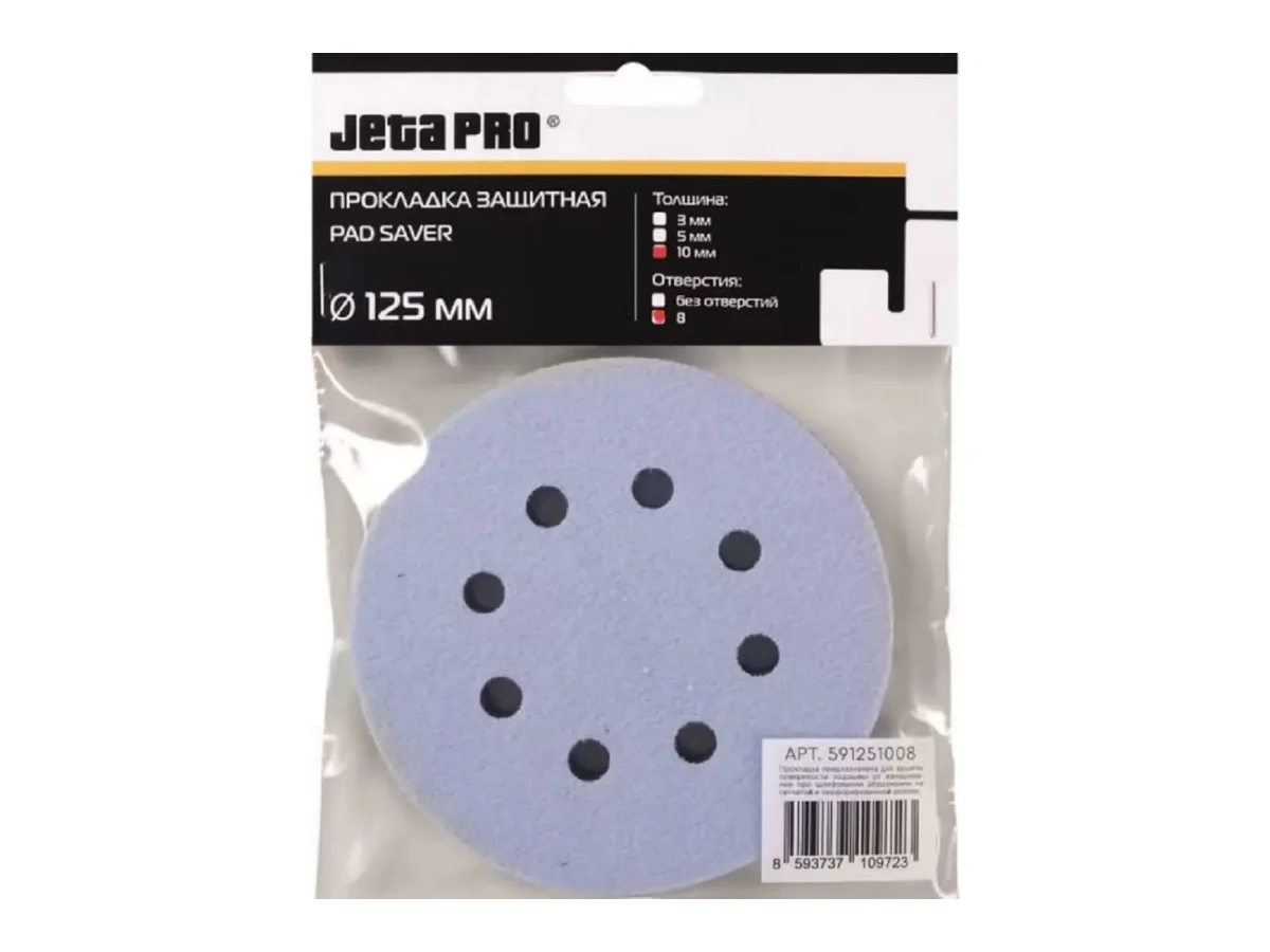 Прокладка защитная на машинку 125 мм JETA PRO, 67 отверстий. Предназначена для защиты подошвы шлифовальной машинки с диаметром 125 мм от повреждений при работе со шлифовальными материалами. Ввиду наличия поролона и толщины 10мм позволяет производить более мягкую шлифовку больших поверхностей сложной формы.