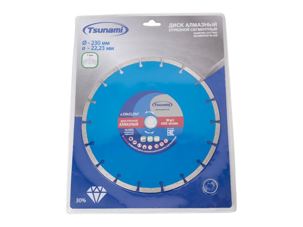 Диск алмазный сегментный TSUNAMI предназначен для резки различных марок бетона, кирпича, камня, тротуарной плитки без применения водяного охлаждения. Высота алмазного слоя сегмента 7 мм (диск голубого цвета), 10 мм (диск темно-синего цвета). Для профессионального и бытового использования на УШМ соответствующего типоразмера.