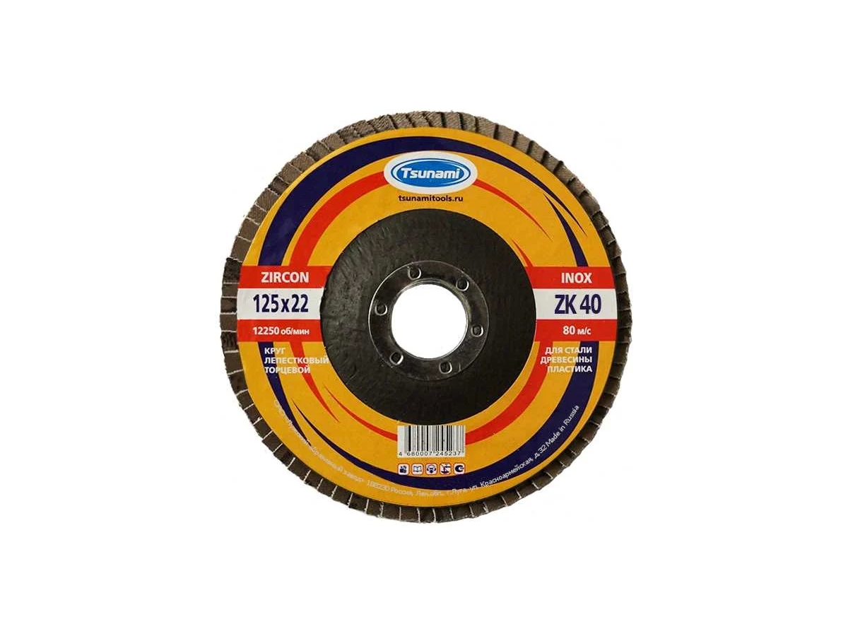 Круг лепестковый торцевой Tsunami КЛТ1 125х22 ZK40 38А 40/Р40 на основе циркониевого электрокорунда предназначен для использования на УШМ и наилучшим образом подходит для зачистки обдирки уголков, труб, листовых материалов из нержавеющих сталей.