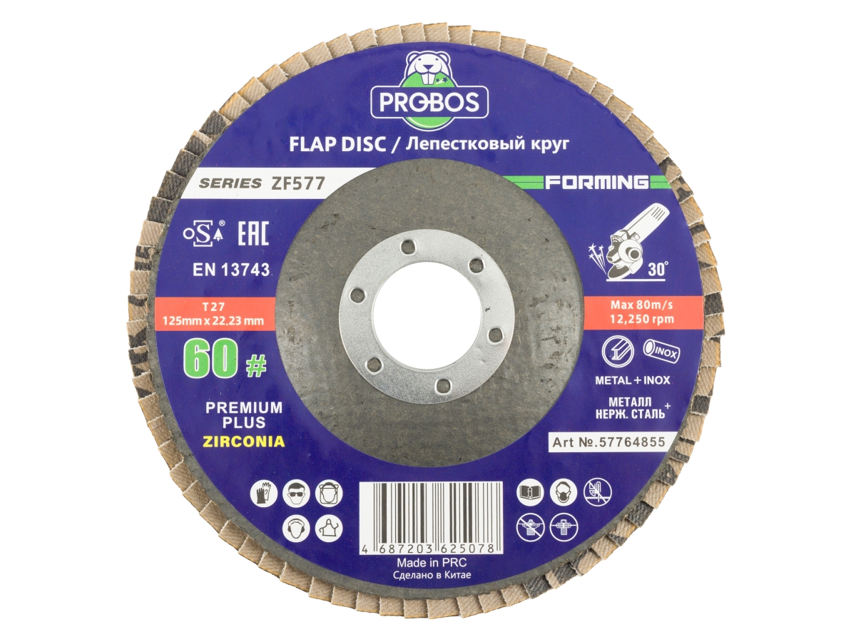 Лепестковые круги PROBOS Forming ZF577 - универсальные торцевые лепестковые шлифовальные круги с оксидом циркония на плотной полиэфирной основе идеально подходят для операций, требующих большого нажима, например, для снятия фаски.