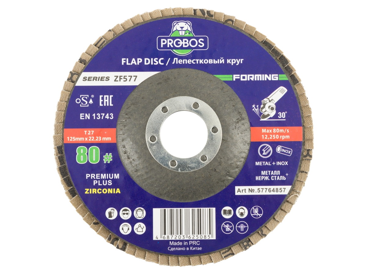 Лепестковые круги PROBOS Forming ZF577 - универсальные торцевые лепестковые шлифовальные круги с оксидом циркония на плотной полиэфирной основе идеально подходят для операций, требующих большого нажима, например, для снятия фаски.