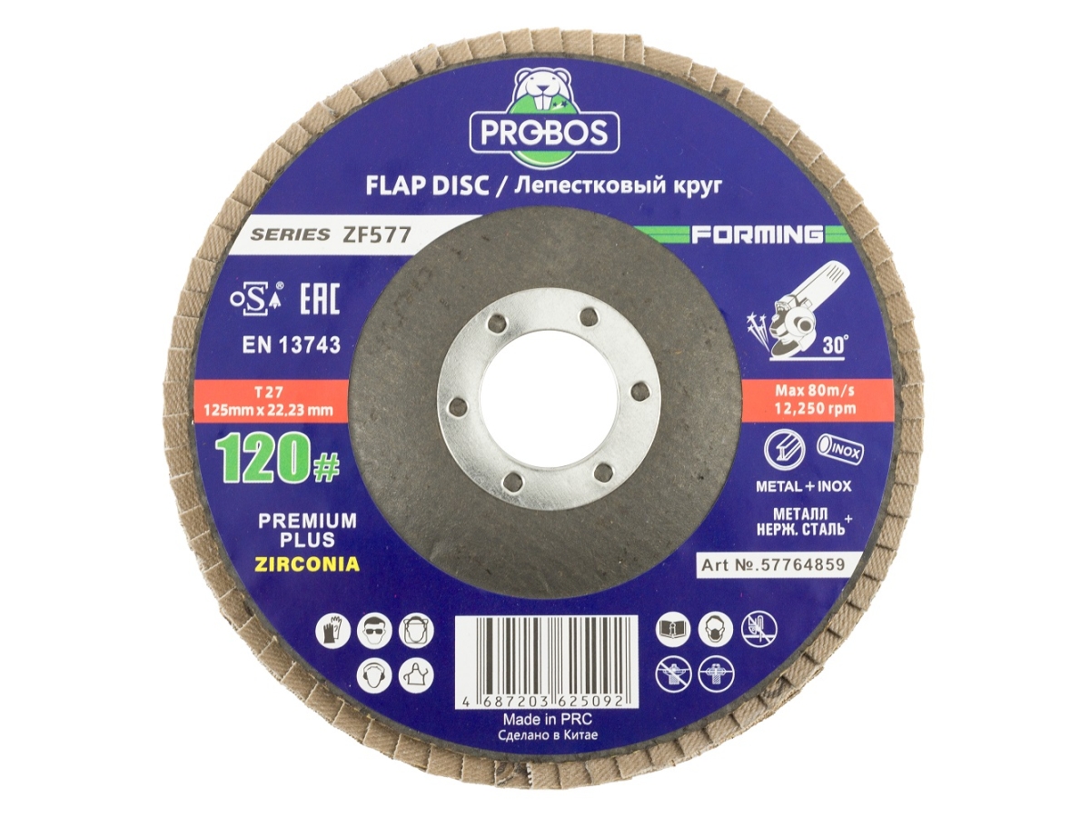 Лепестковые круги PROBOS Forming ZF577 - универсальные торцевые лепестковые шлифовальные круги с оксидом циркония на плотной полиэфирной основе идеально подходят для операций, требующих большого нажима, например, для снятия фаски.