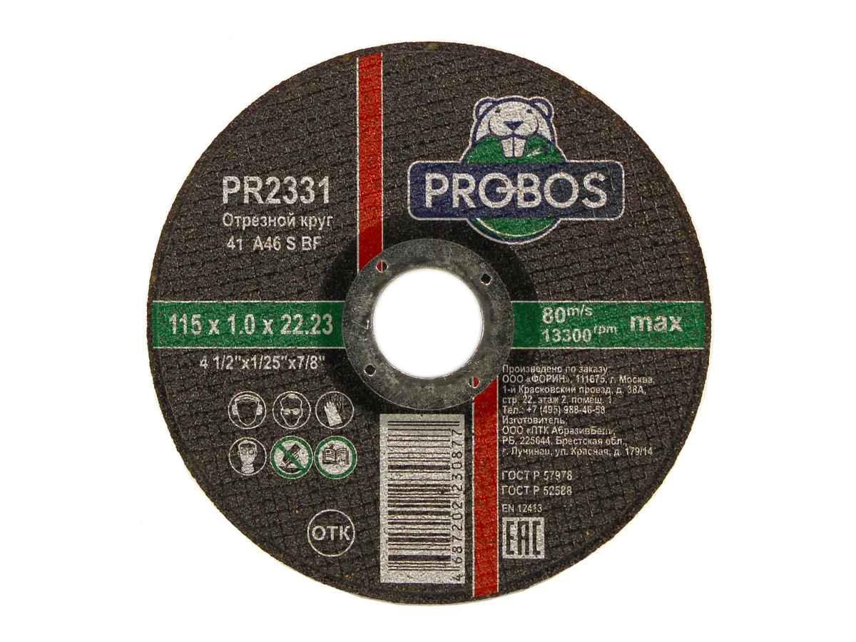 Круг отрезной абразивный 115x1.0x22.23 мм PROBOS PR2331 состоит из смесей электрокорунда нормального (14А) зернистостью 46. Основу бакелитовой связки составляет фенолформальдегидная смола порошкообразная (СФП) и жидкая (БЖ).Также в смеси используются неорганические наполнители, такие как криолит, пирит.