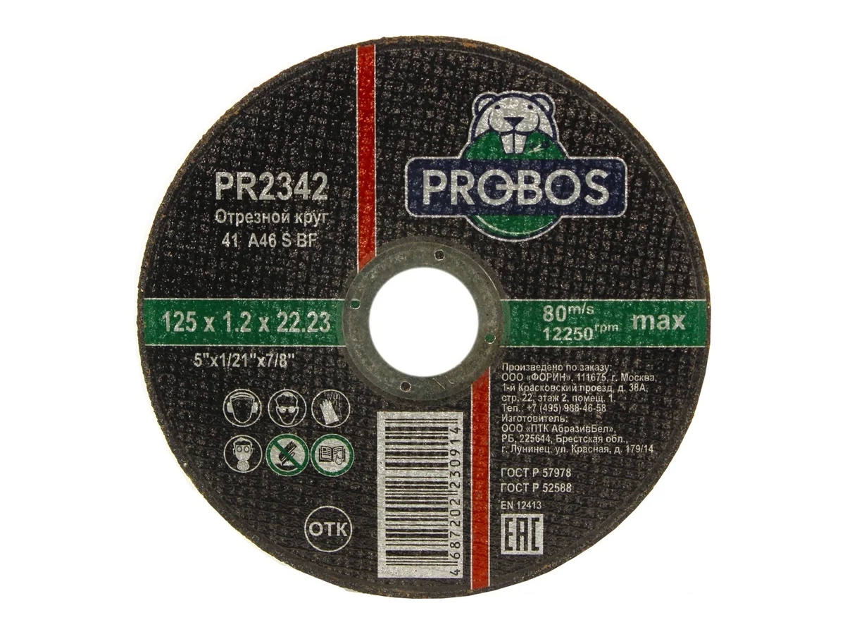 Круг отрезной абразивный 125x1.2x22.23 мм PROBOS PR2342 состоит из смесей электрокорунда нормального (14А) зернистостью 46. Основу бакелитовой связки составляет фенолформальдегидная смола порошкообразная (СФП) и жидкая (БЖ).Также в смеси используются неорганические наполнители, такие как криолит, пирит.