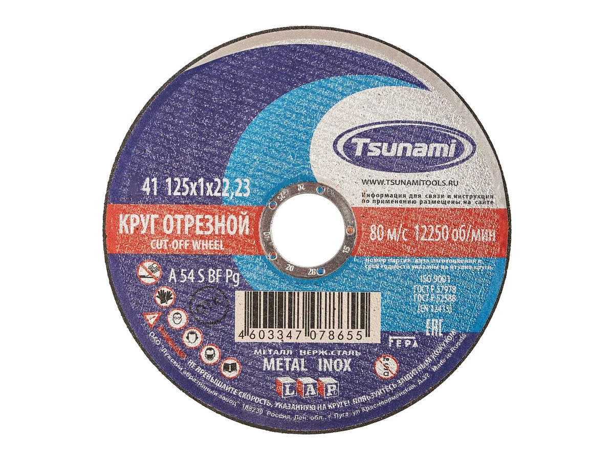Предлагаем Вашему вниманию высококачественные отрезные круги Tsunami. Круги производят на современном заводе в России из качественного сырья. Всё сырьё проходит строгий входной контроль на соответствие требований стандарта. Жесткий контроль качества на каждом этапе производства, применение современных материалов и строгое соблюдение всех требований и норм производства, обеспечивают кругам Tsunami высокую производительность и безопасность.