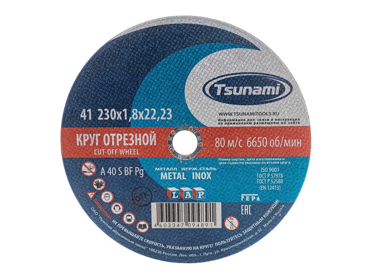 Предлагаем Вашему вниманию высококачественные отрезные круги Tsunami. Круги производят на современном заводе в России из качественного сырья. Всё сырьё проходит строгий входной контроль на соответствие требований стандарта. Жесткий контроль качества на каждом этапе производства, применение современных материалов и строгое соблюдение всех требований и норм производства, обеспечивают кругам Tsunami высокую производительность и безопасность.