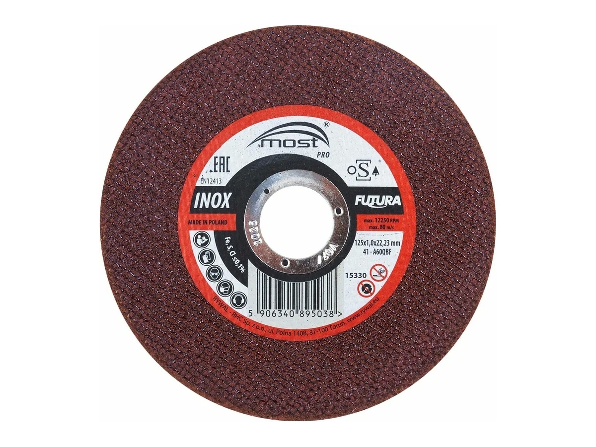 Круг отрезной Pro inox 41 по нержавеющей стали 125x1x22 мм MOST 9414712510 армированный полимерный отрезной круг повышенной твёрдости и срока службы. Сделан из модифицированных корундовых зёрен. Применяется для резки нержавеющей в сложных промышленных условиях.