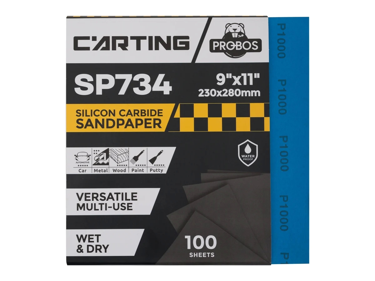 Бумага абразивная PROBOS Carting SP734 - водостойкая абразивная бумага на основе латексной бумаги, изготавливается с применением минералов карбида кремния с чрезвычайно высокой режущей способностью. Предназначена для сухой и влажной шлифовки с водой вручную или с плоскошлифовальной машиной.