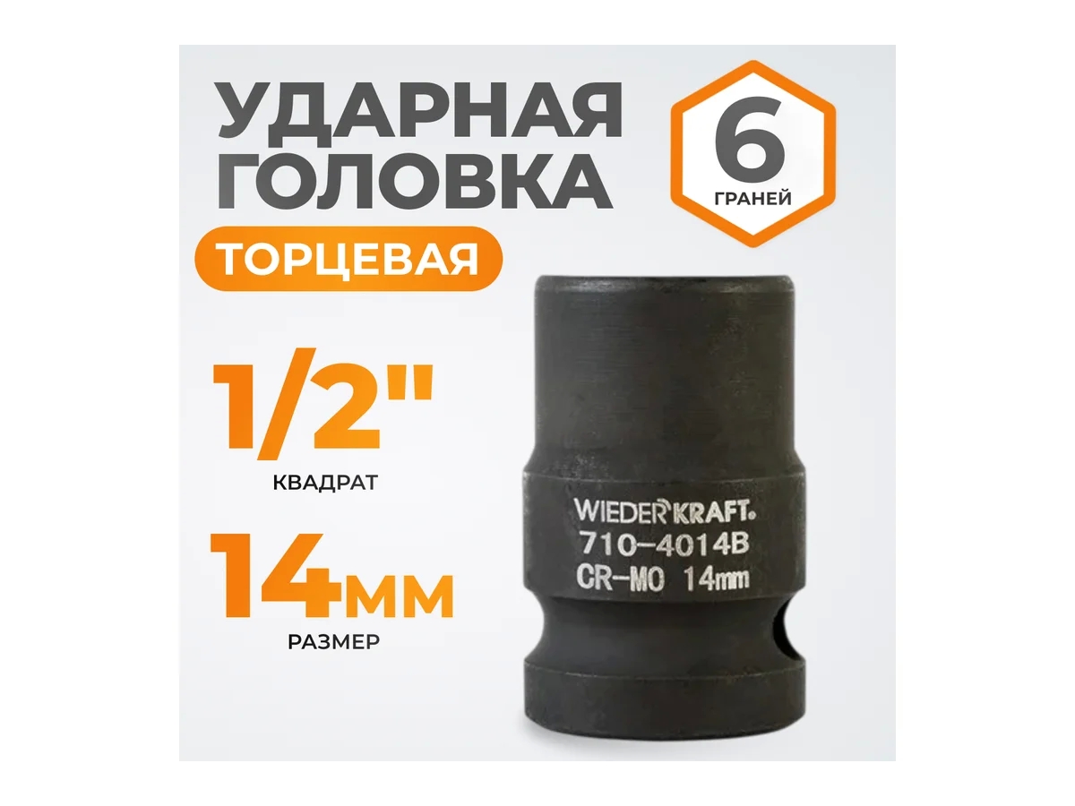 Ударная головка WiederKraft WDK-710-4014 (14 мм) с посадочным квадратом 1/2? и 6-гранным рабочим профилем. Выполнена из высококачественной хром-молибденовой стали 42 CrMo. Включения хрома и молибдена делают изделие прочным, устойчивым к нагрузкам и деформациям.