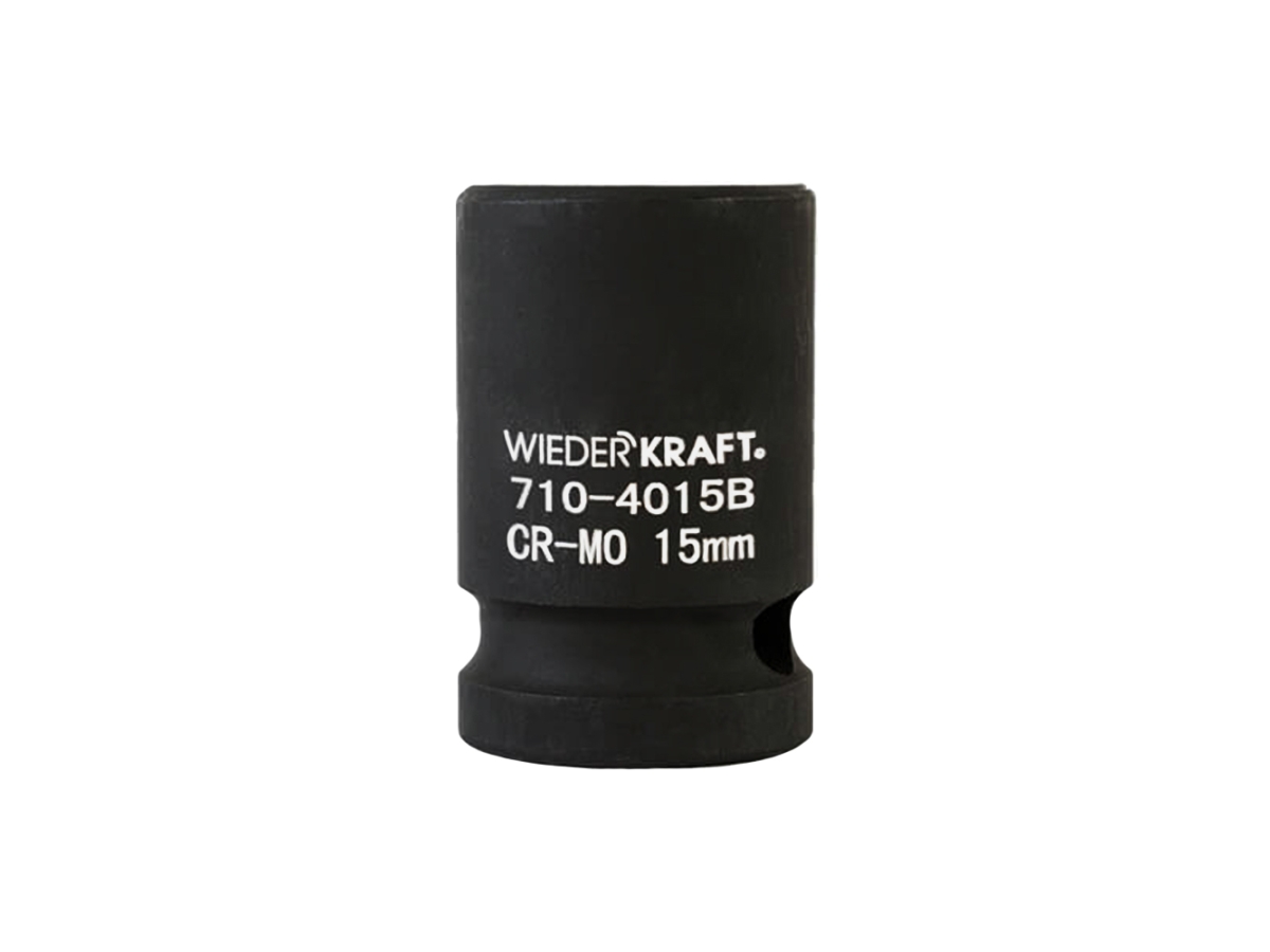 Ударная головка WiederKraft WDK-710-4015 (15 мм) с посадочным квадратом 1/2″ и 6-гранным рабочим профилем. Выполнена из высококачественной хром-молибденовой стали 42 CrMo. Включения хрома и молибдена делают изделие прочным, устойчивым к нагрузкам и деформациям.