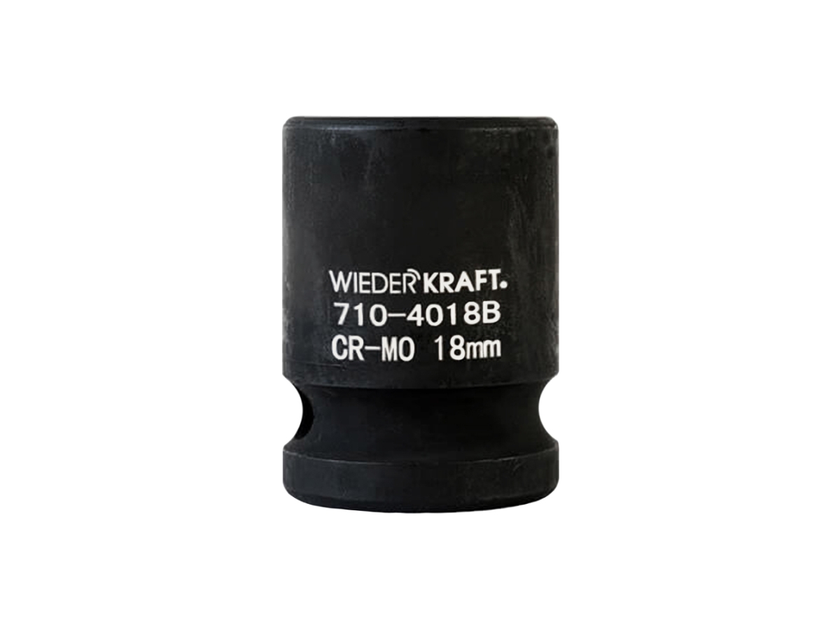 Ударная головка WiederKraft WDK-710-4018 (18 мм) с посадочным квадратом 1/2″ и 6-гранным рабочим профилем. Выполнена из высококачественной хром-молибденовой стали 42 CrMo. Включения хрома и молибдена делают изделие прочным, устойчивым к нагрузкам и деформациям.