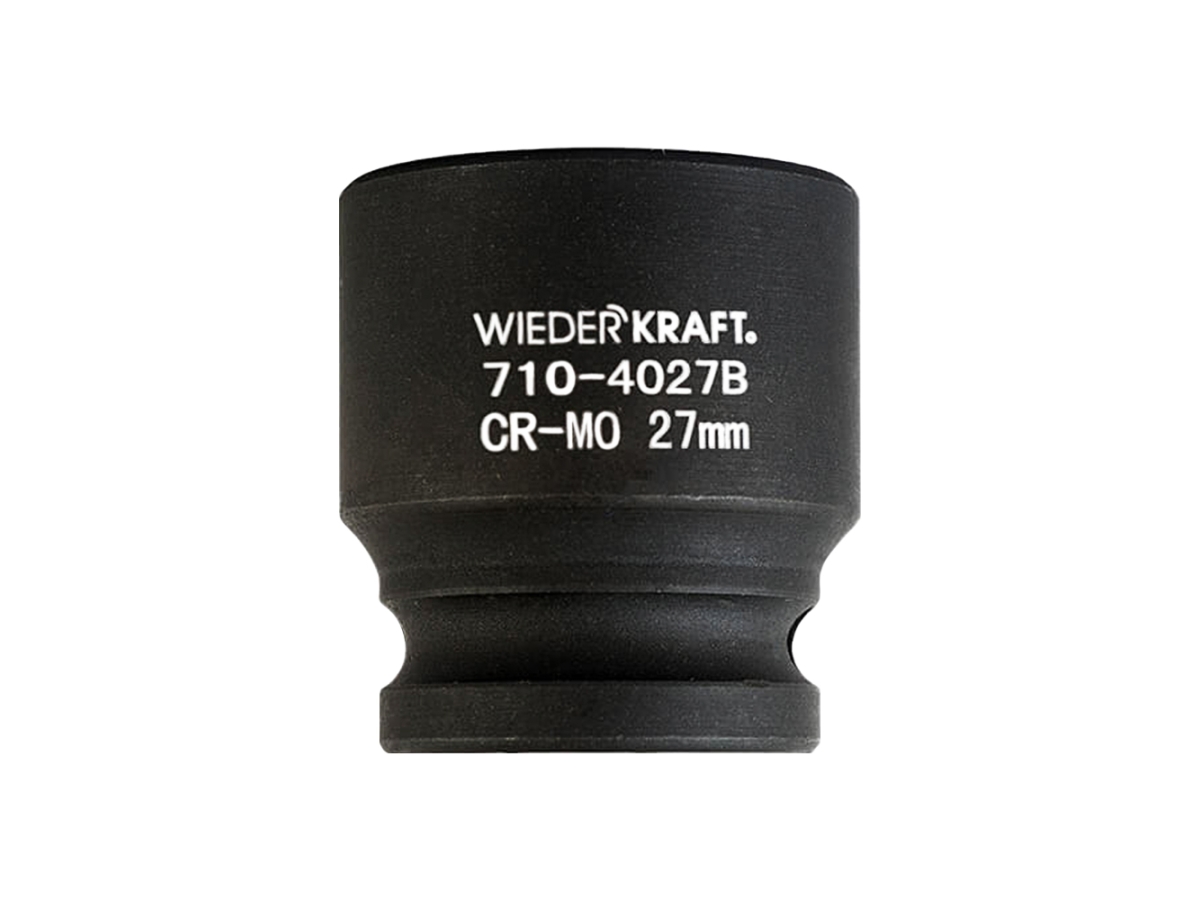 Ударная головка WiederKraft WDK-710-4027 (27 мм) с посадочным квадратом 1/2″ и 6-гранным рабочим профилем. Выполнена из высококачественной хром-молибденовой стали 42 CrMo. Включения хрома и молибдена делают изделие прочным, устойчивым к нагрузкам и деформациям.