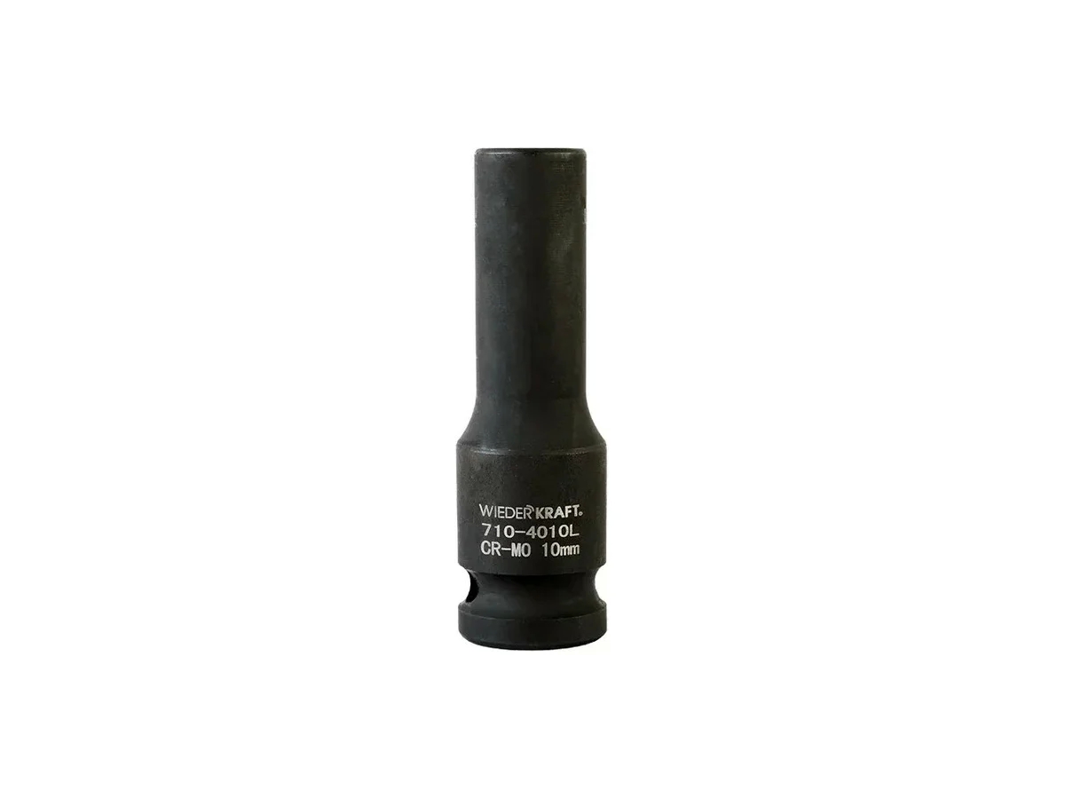 Глубокая ударная головка WiederKraft WDK-710-4010L (10 мм) с посадочным квадратом 1/2? и 6-гранным рабочим профилем. Выполнена из высококачественной хром-молибденовой стали 42 CrMo. Включения хрома и молибдена делают изделие прочным, устойчивым к нагрузкам и деформациям.