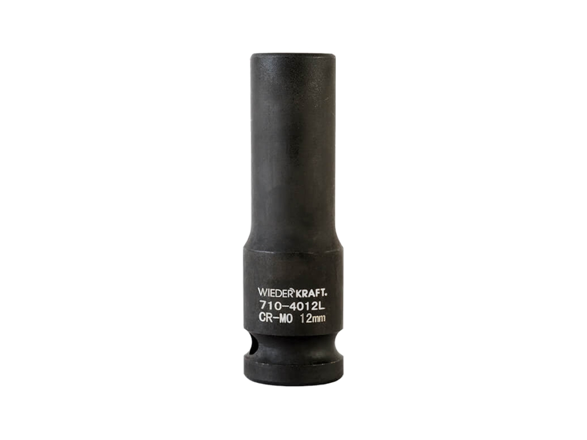 Глубокая ударная головка WiederKraft WDK-710-4012L (12 мм) с посадочным квадратом 1/2″ и 6-гранным рабочим профилем. Выполнена из высококачественной хром-молибденовой стали 42 CrMo. Включения хрома и молибдена делают изделие прочным, устойчивым к нагрузкам и деформациям.