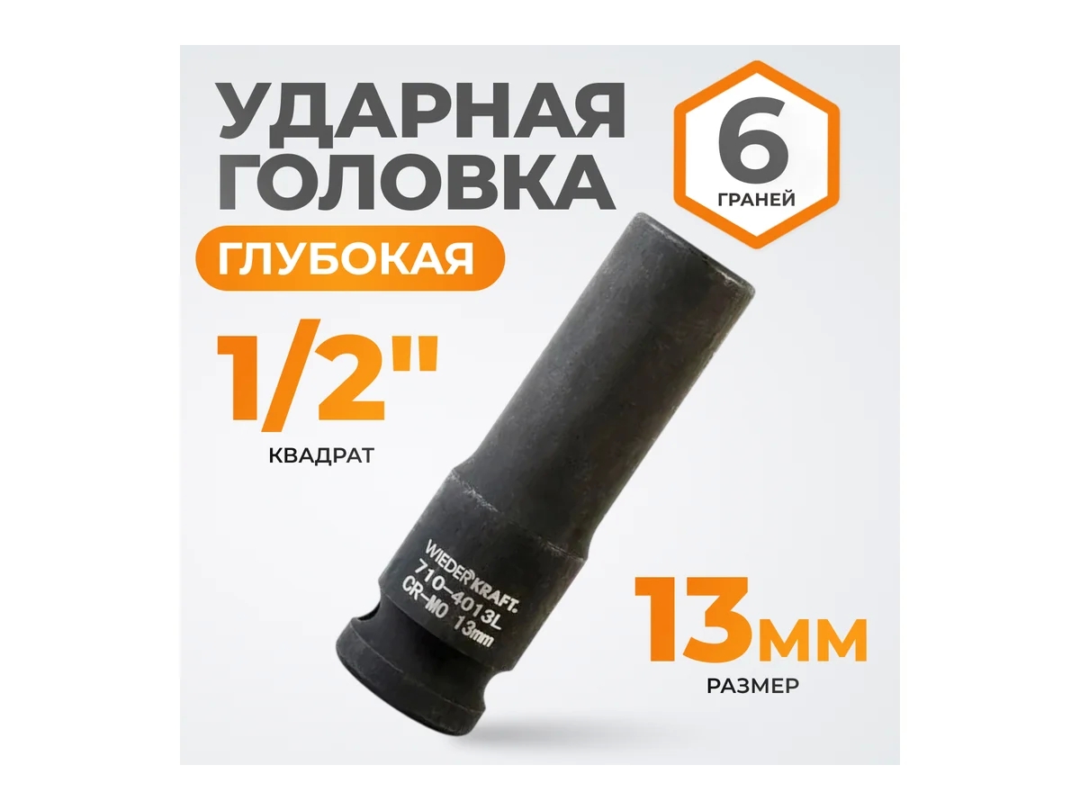 Глубокая ударная головка WiederKraft WDK-710-4013L (13 мм) с посадочным квадратом 1/2? и 6-гранным рабочим профилем. Выполнена из высококачественной хром-молибденовой стали 42 CrMo. Включения хрома и молибдена делают изделие прочным, устойчивым к нагрузкам и деформациям.