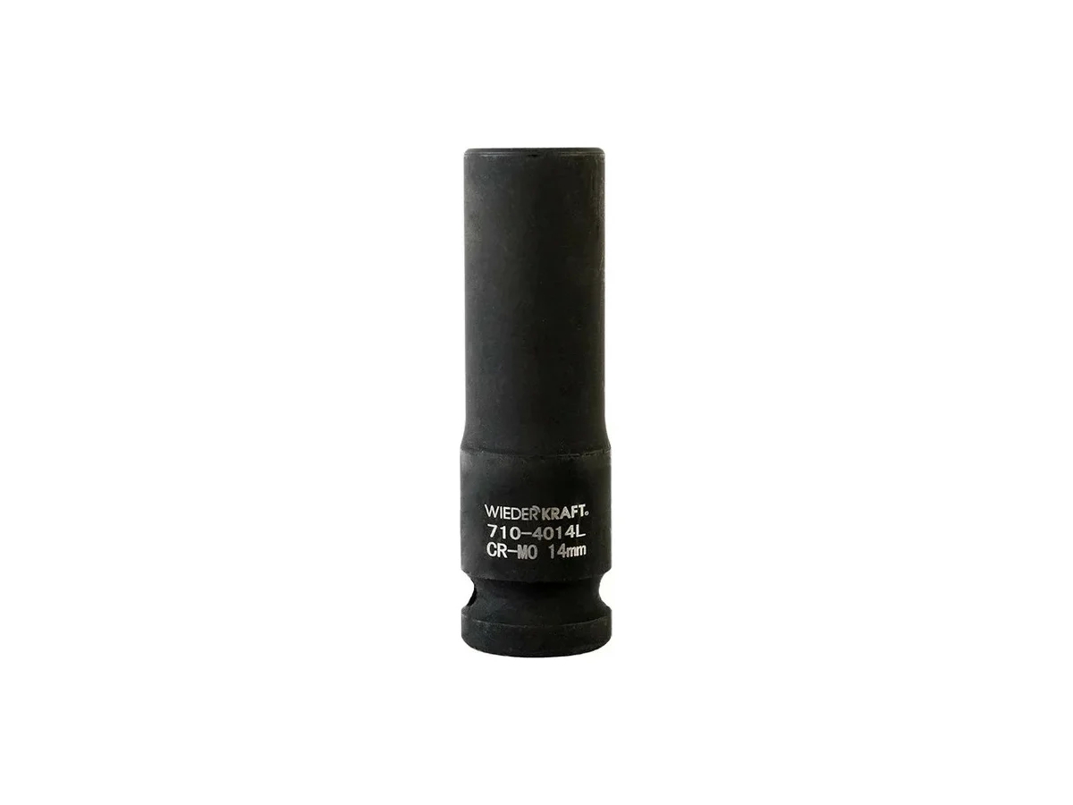 Глубокая ударная головка WiederKraft WDK-710-4014L (14 мм) с посадочным квадратом 1/2? и 6-гранным рабочим профилем. Выполнена из высококачественной хром-молибденовой стали 42 CrMo. Включения хрома и молибдена делают изделие прочным, устойчивым к нагрузкам и деформациям.