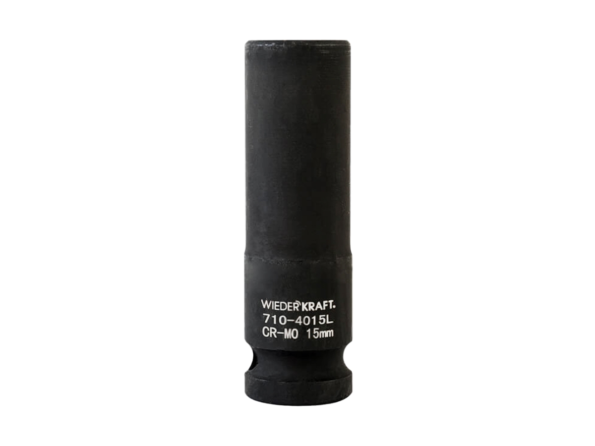 Глубокая ударная головка WiederKraft WDK-710-4015L (15 мм) с посадочным квадратом 1/2″ и 6-гранным рабочим профилем. Выполнена из высококачественной хром-молибденовой стали 42 CrMo. Включения хрома и молибдена делают изделие прочным, устойчивым к нагрузкам и деформациям.