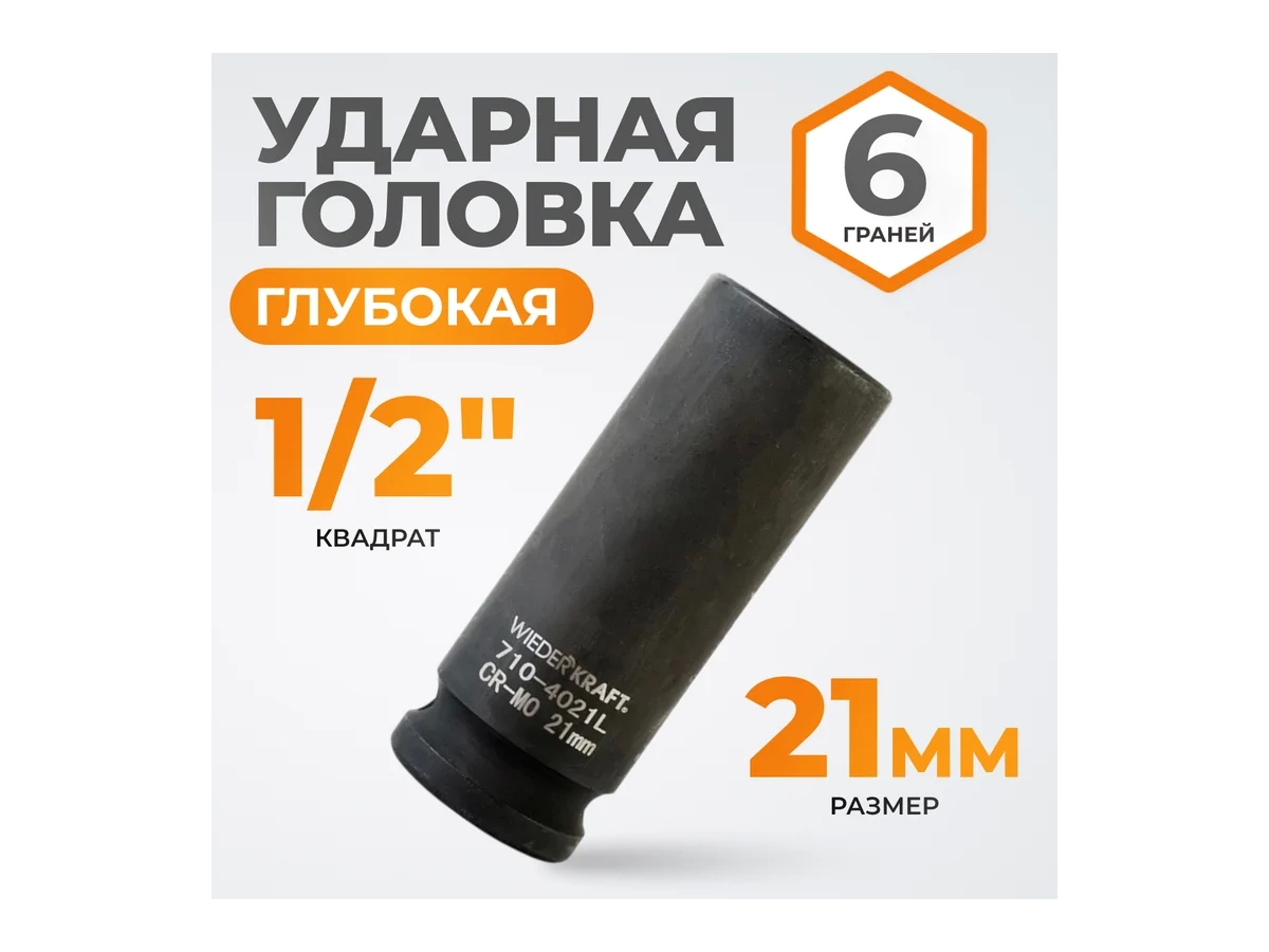 Глубокая ударная головка WiederKraft WDK-710-4019L (21 мм) с посадочным квадратом 1/2? и 6-гранным рабочим профилем. Выполнена из высококачественной хром-молибденовой стали 42 CrMo. Включения хрома и молибдена делают изделие прочным, устойчивым к нагрузкам и деформациям.