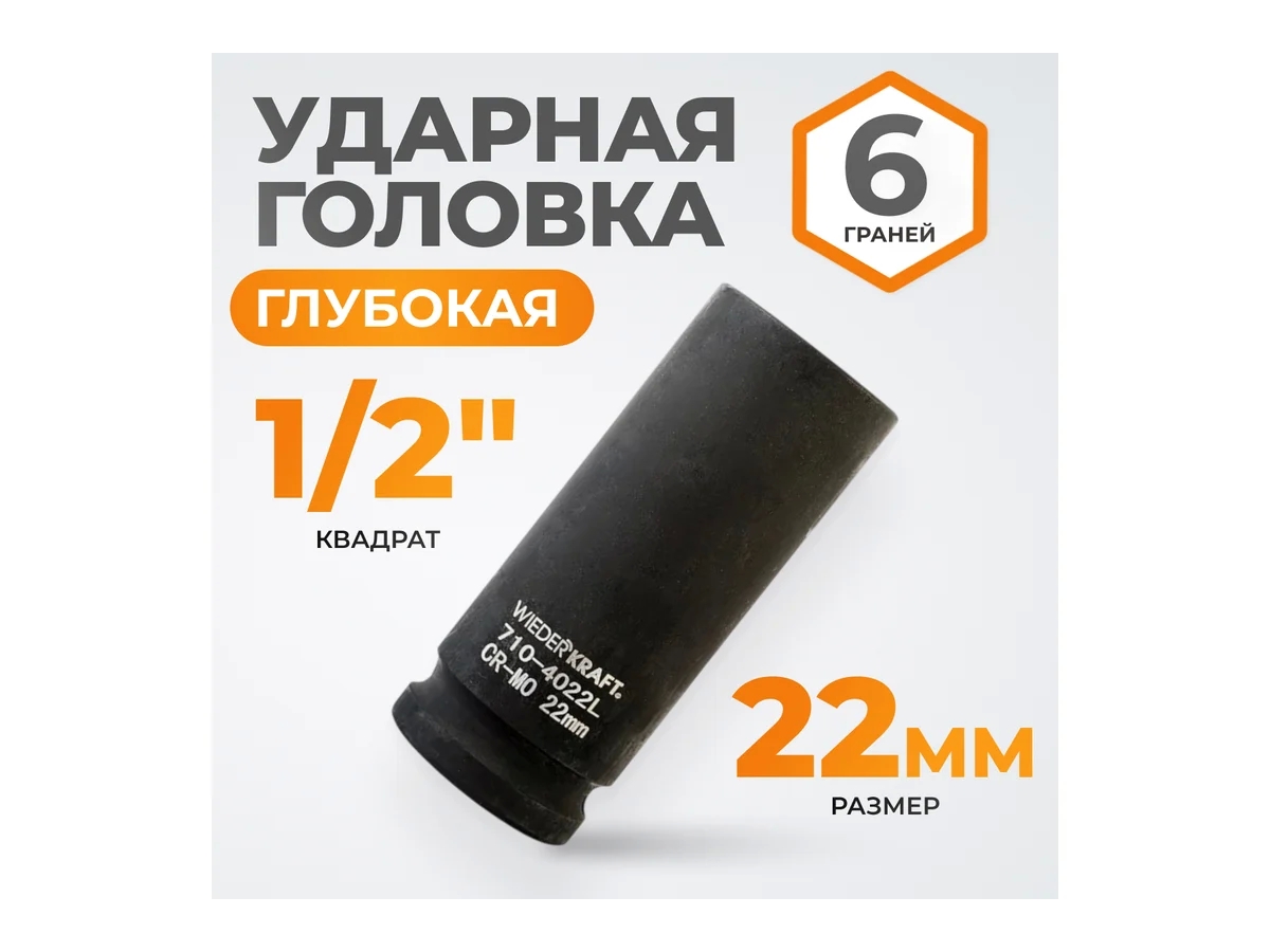 Глубокая ударная головка WiederKraft WDK-710-4022L (22 мм) с посадочным квадратом 1/2? и 6-гранным рабочим профилем. Выполнена из высококачественной хром-молибденовой стали 42 CrMo. Включения хрома и молибдена делают изделие прочным, устойчивым к нагрузкам и деформациям.