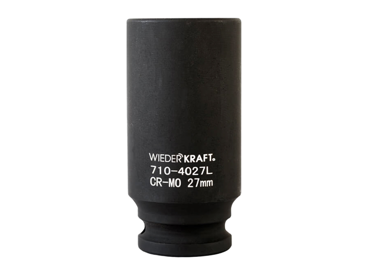 Глубокая ударная головка WiederKraft WDK-710-4027L (27 мм) с посадочным квадратом 1/2″ и 6-гранным рабочим профилем. Выполнена из высококачественной хром-молибденовой стали 42 CrMo. Включения хрома и молибдена делают изделие прочным, устойчивым к нагрузкам и деформациям.