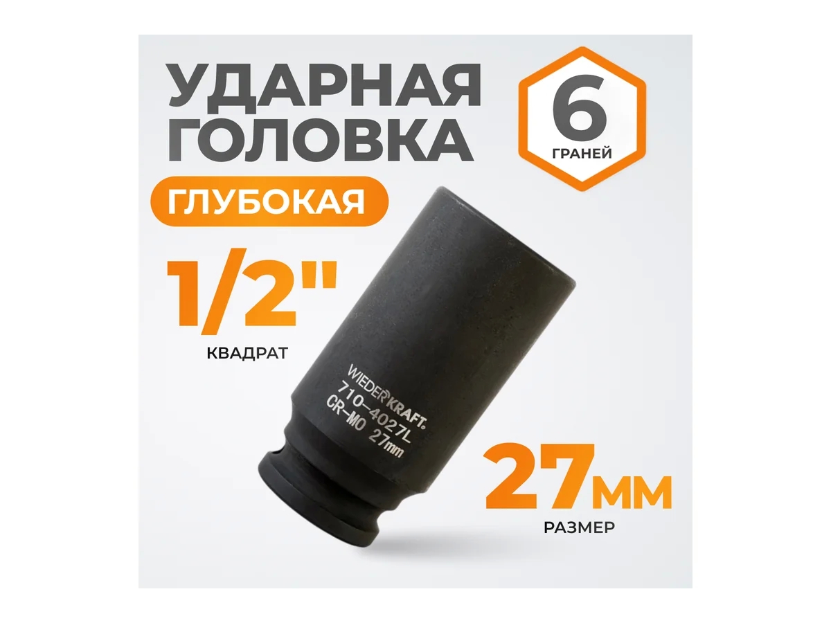 Глубокая ударная головка WiederKraft WDK-710-4027L (27 мм) с посадочным квадратом 1/2? и 6-гранным рабочим профилем. Выполнена из высококачественной хром-молибденовой стали 42 CrMo. Включения хрома и молибдена делают изделие прочным, устойчивым к нагрузкам и деформациям.