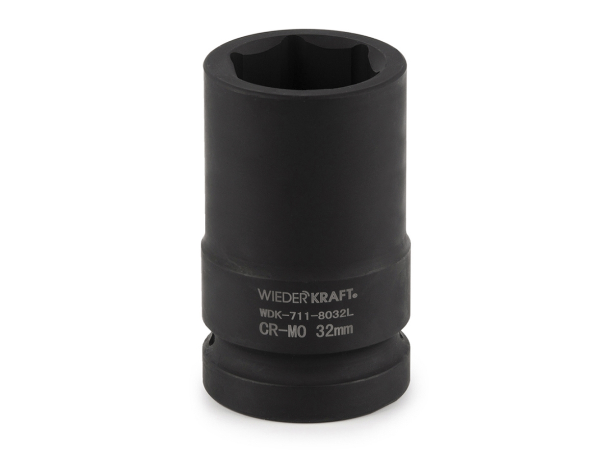 Глубокая ударная головка WiederKraft WDK-711-8032L (32 мм) с посадочным квадратом 1″ и 6-гранным рабочим профилем. Выполнена из высококачественной хром-молибденовой стали 42 CrMo. Включения хрома и молибдена делают изделие прочным, устойчивым к нагрузкам и деформациям.