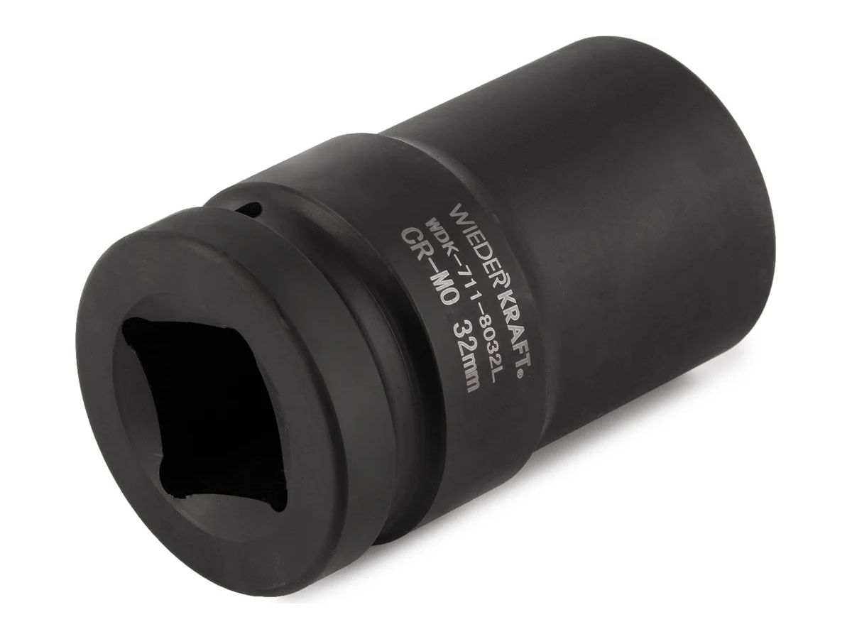 Глубокая ударная головка WiederKraft WDK-711-8032L (32 мм) с посадочным квадратом 1? и 6-гранным рабочим профилем. Выполнена из высококачественной хром-молибденовой стали 42 CrMo. Включения хрома и молибдена делают изделие прочным, устойчивым к нагрузкам и деформациям.