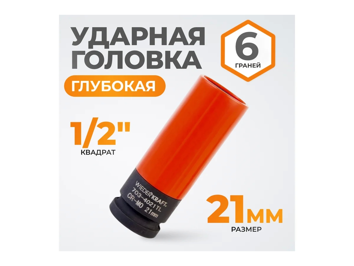 Глубокая ударная головка WiederKraft WDK-703-4021L (21 мм) с посадочным квадратом 1/2″ и 6-гранным рабочим профилем. Выполнена из высококачественной хром-молибденовой стали 42 CrMo. Включения хрома и молибдена делают изделие прочным, устойчивым к нагрузкам и деформациям.