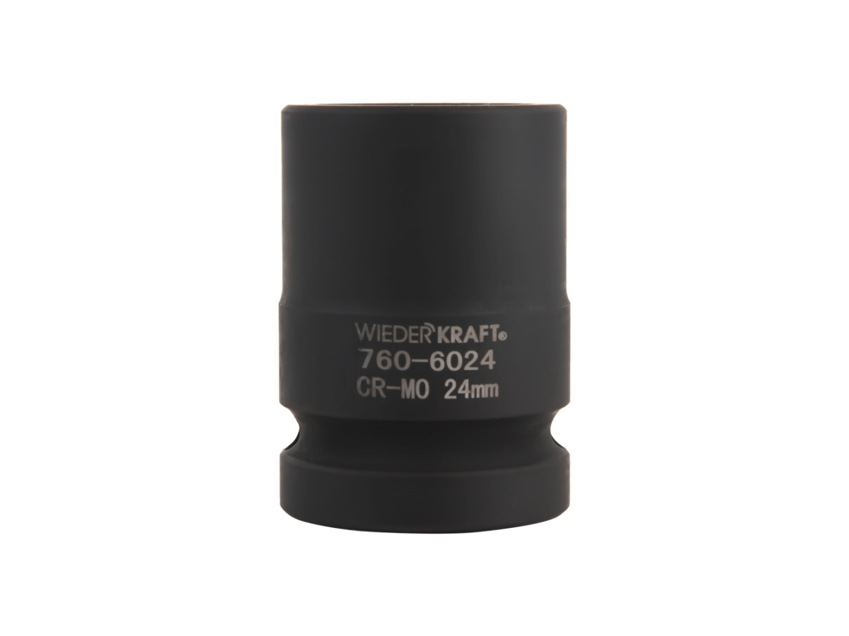 Ударная головка WiederKraft WDK-760-6024 (24 мм) с посадочным квадратом 3/4″ и 6-гранным рабочим профилем. Выполнена из высококачественной хром-молибденовой стали 42 CrMo. Включения хрома и молибдена делают изделие прочным, устойчивым к нагрузкам и деформациям.
